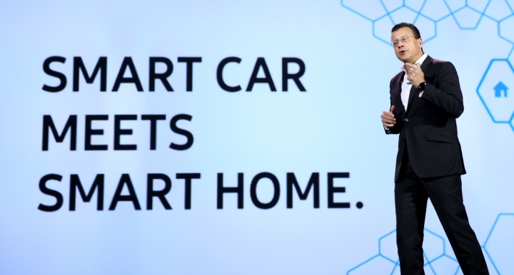 BMW'S Steven Althaus presents a first at CES 2016: a customer-ready solution of Smart Things integration available today - Smart Car meets Smart Home, Thursday, Jan. 7, 2016, in Las Vegas. Your BMW is now a personal IoT cockpit allowing you to control your Samsung ecosystem from your car.