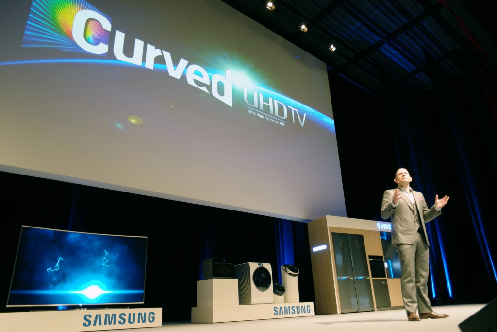 마이클 졸러(Michael Zoeller) 삼성전자 유럽 마케팅총괄 디렉터가 유럽 지역 미디어와 파트너들에게 삼성전자의 2015년 제품을 소개하는 모습.