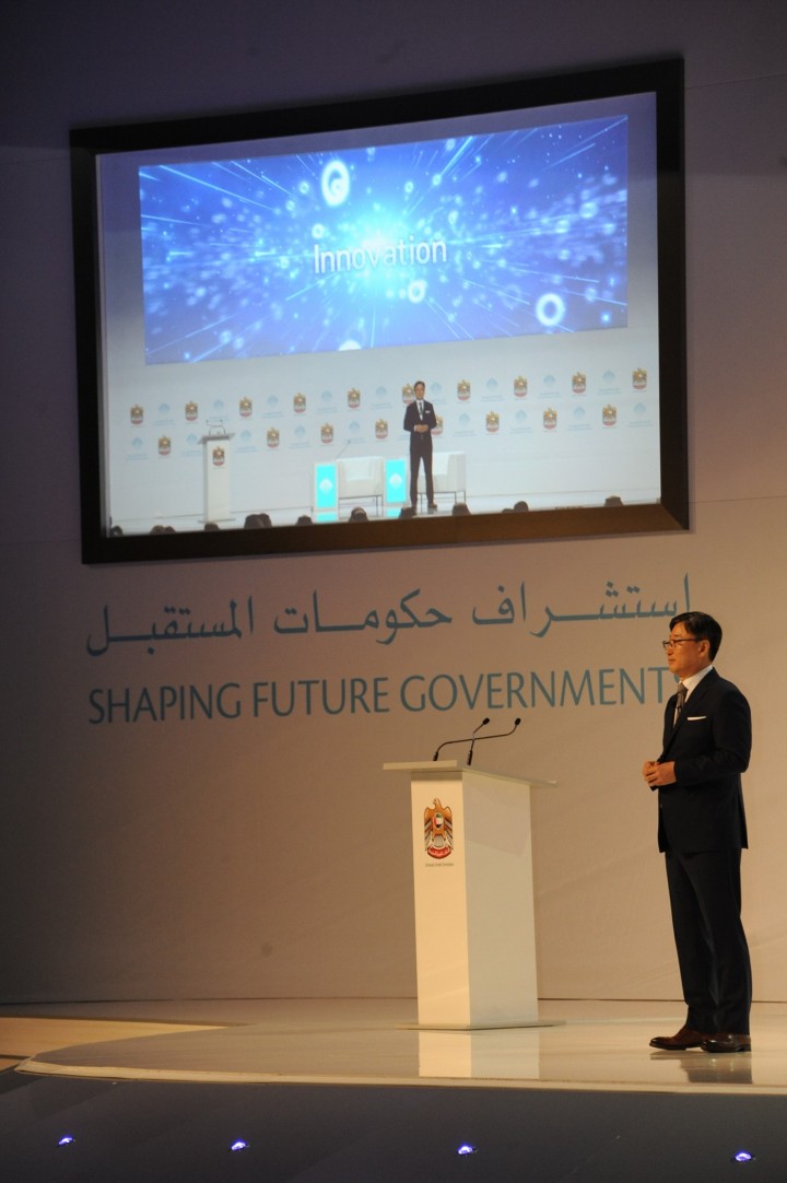 삼성전자 윤부근 대표이사가 9일 두바이 메디나 쥬메이라 호텔에서 열린 ‘거번먼트 서밋(The Government Summit) 2015’에서 삼성전자의 혁신을 주제로 연설하는 모습.