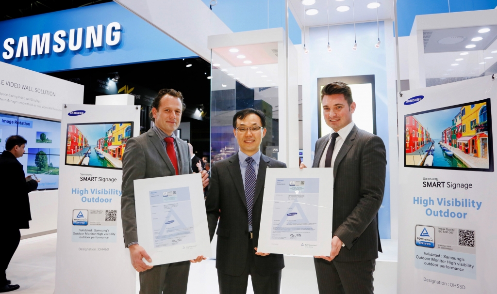 삼성전자가 지난 10일 네덜란드 암스테르담에서 열린 ISE 2015 삼성전자 전시장에서 수상식을 갖고 TUV 라인란드로부터 검증서를 전달 받았다. 사진 왼쪽부터 패트릭 부맨(Patrick Booman) TUV 라인란드 디렉터, 삼성전자 영상디스플레이사업부 최용훈 상무, 안드레 아도니(Andre Adonyi) TUV 라인란드 매니저