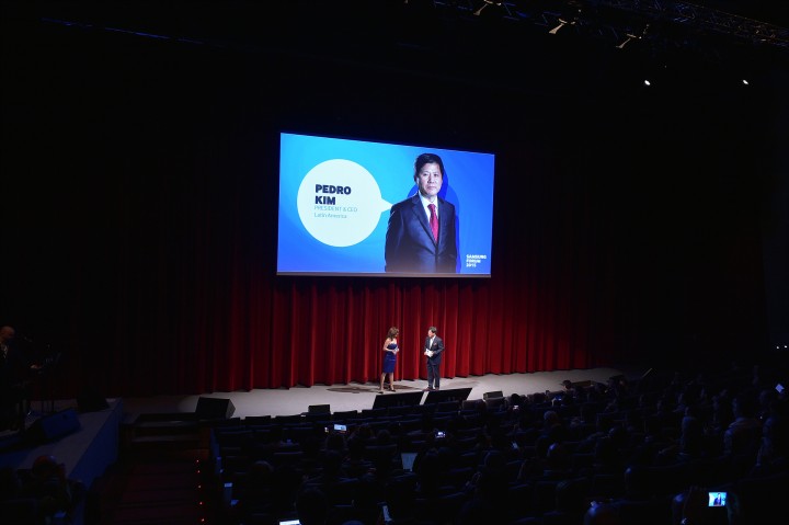 모나코에서 열린 삼성 중남미 포럼 프레스 컨퍼런스에서 삼성전자 김정환 중남미 총괄(전무)이 환영 인사를 하고 있다.