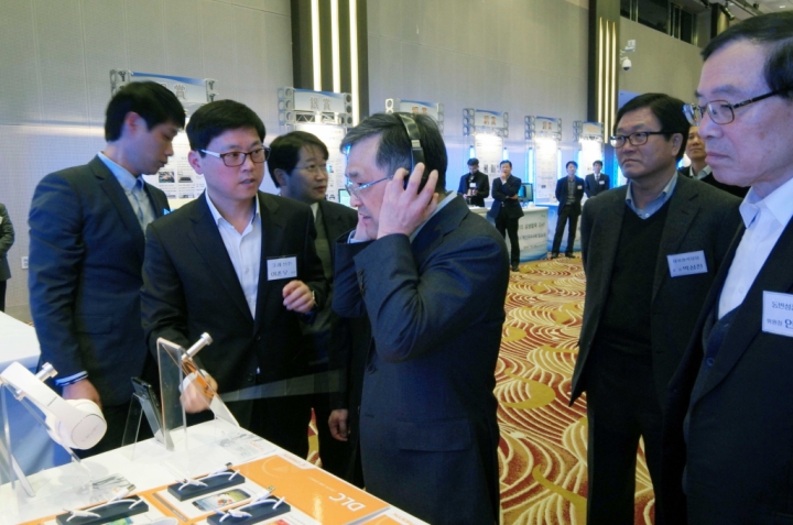 11일 양재동 더케이서울호텔에서 열린 2015 상생협력데이에서 삼성전자 권오현 대표이사 부회장이 대상을 수상한 크레신의 노이즈 캔슬링 헤드폰을 착용해보고 있다.