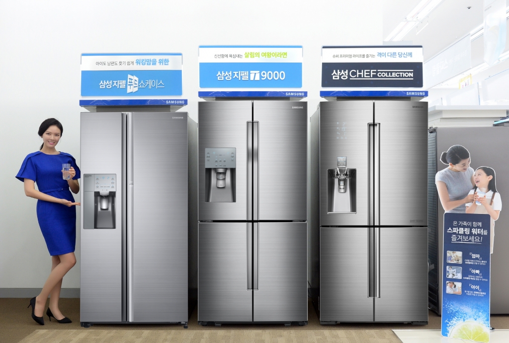 삼성전자 모델이 4일 서초동 삼성 디지털프라자 서초점에서 '지펠 푸드쇼케이스 스파클링', '지펠 T9000 스파클링', '셰프컬렉션'(왼쪽부터) 등 삼성 스파클링 냉장고를 소개하고 있다.이번에 출시한 '지펠 푸드쇼케이스 스파클링'은 '지펠 푸드쇼케이스' 냉장고에 3단계로 선택할 수 있는 단계별 탄산 농도를 기존 제품보다 한층 강화한 탄산수 제조 시스템을 적용한 냉장고다.