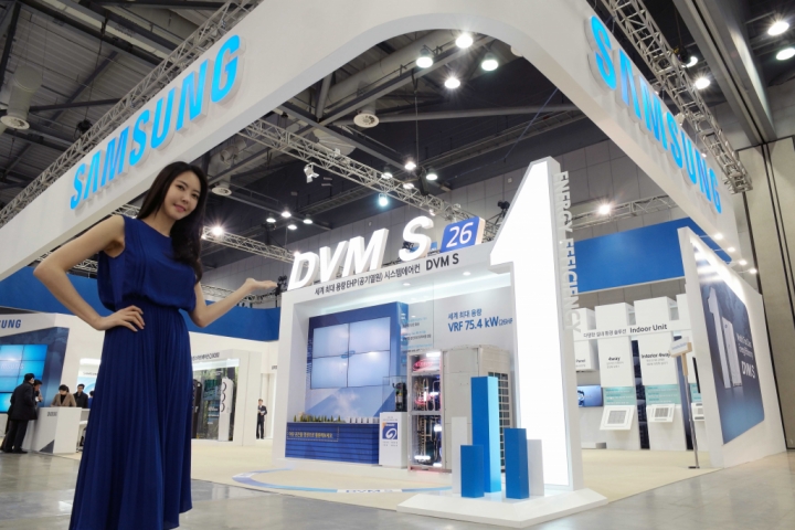 삼성전자 모델이 10일 일산 킨텍스에서 열리는 '제13회 한국국제냉난방공조전(HARFKO 2015)' 삼성전자 전시관에서 EHP(Electronic Heat Pumpㆍ공기열원) 시스템에어컨 중 세계 최대인 75.4kW(26마력)의 용량을 갖춘 'DVM S'를 소개하고 있다.