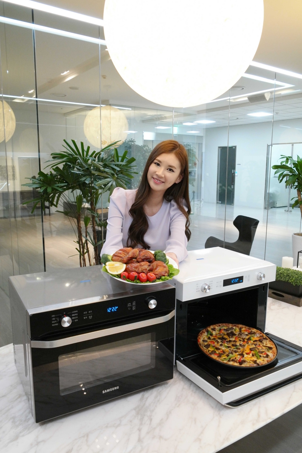 삼성전자 모델이 11일 삼성전자 수원사업장 생활가전동 프리미엄 하우스에서 더 커진 그릴로 조리 기능이 한층 강화된 유러피언 오리지널 '삼성 스마트오븐'을 소개하고 있다.