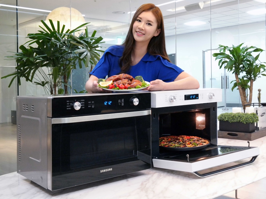 삼성전자 모델이 11일 삼성전자 수원사업장 생활가전동 프리미엄 하우스에서 더 커진 그릴로 조리 기능이 한층 강화된 유러피언 오리지널 '삼성 스마트오븐'을 소개하고 있다.