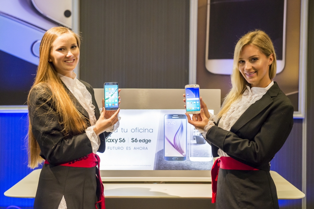 23일(현지시각) 칠레 산티아고에서 열린 삼성전자 갤럭시 S6, 갤럭시 S6 엣지 발표 행사에서 모델들이 제품을 소개하는 모습