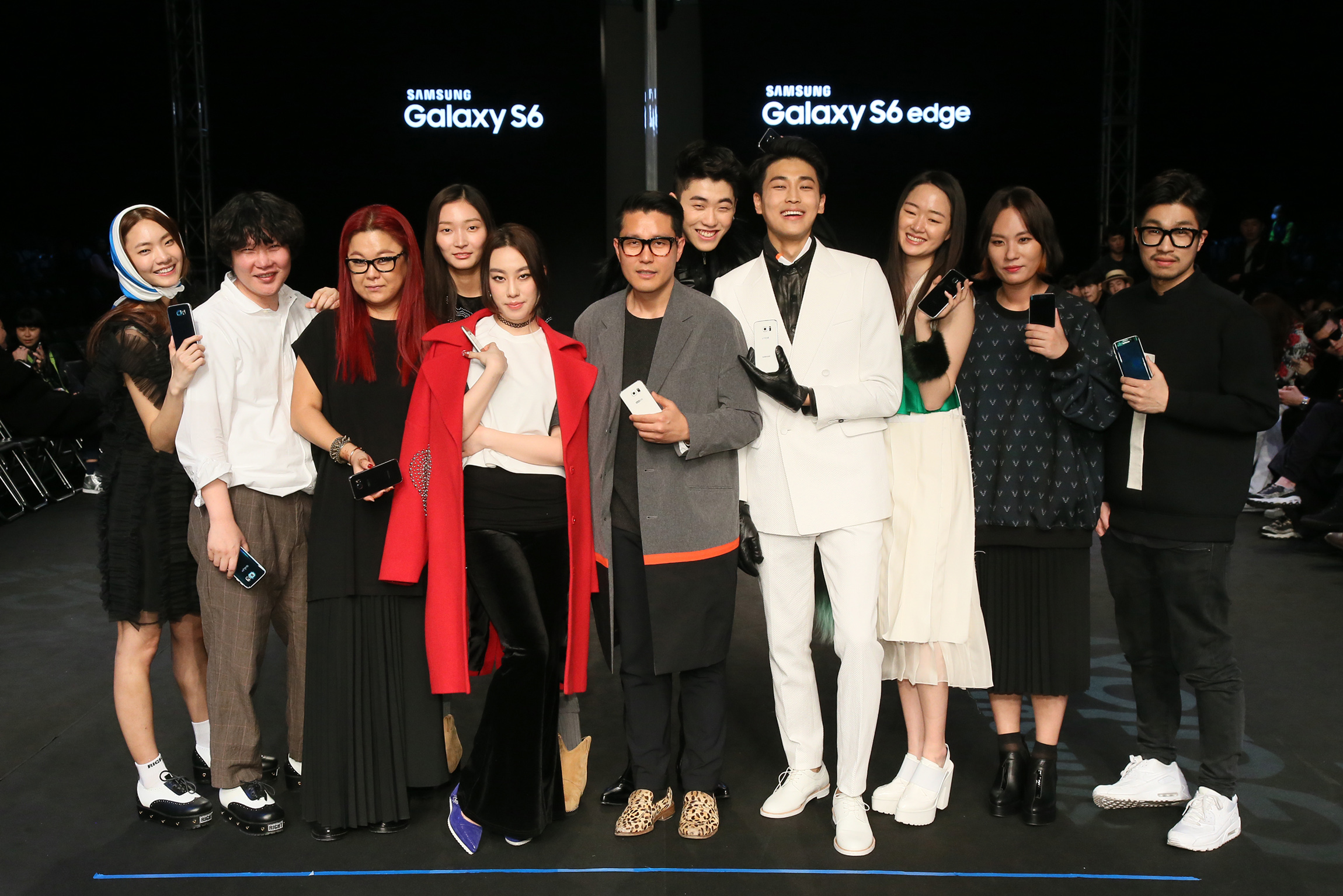 삼성전자 '갤럭시 S6 퍼스트 룩(FIRST LOOK)' 쇼에 참여한 국내 유명 디자이너들이 참여 모델들과 함께 '갤럭시 S6'와 '갤럭시 S6 엣지'를 소개하는 모습. 왼쪽부터 두번째 박승건, 세번째 이주영, 다섯번째 계한희, 여섯번째 한상혁, 열번째, 열한번째 J KOO 디자이너