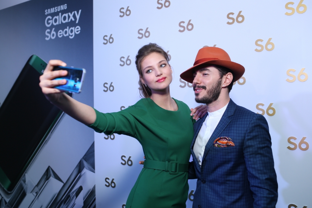 25일(현지시각) 러시아 모스크바에서 열린 삼성전자 갤럭시 S6 월드투어 행사 레드카펫에서 모델 레슈아 카프(Lesya Kaf, 사진 왼쪽)와 가수 티무르 로드리게즈(Timur Rodrigez)가 함께 셀피를 찍는 모습