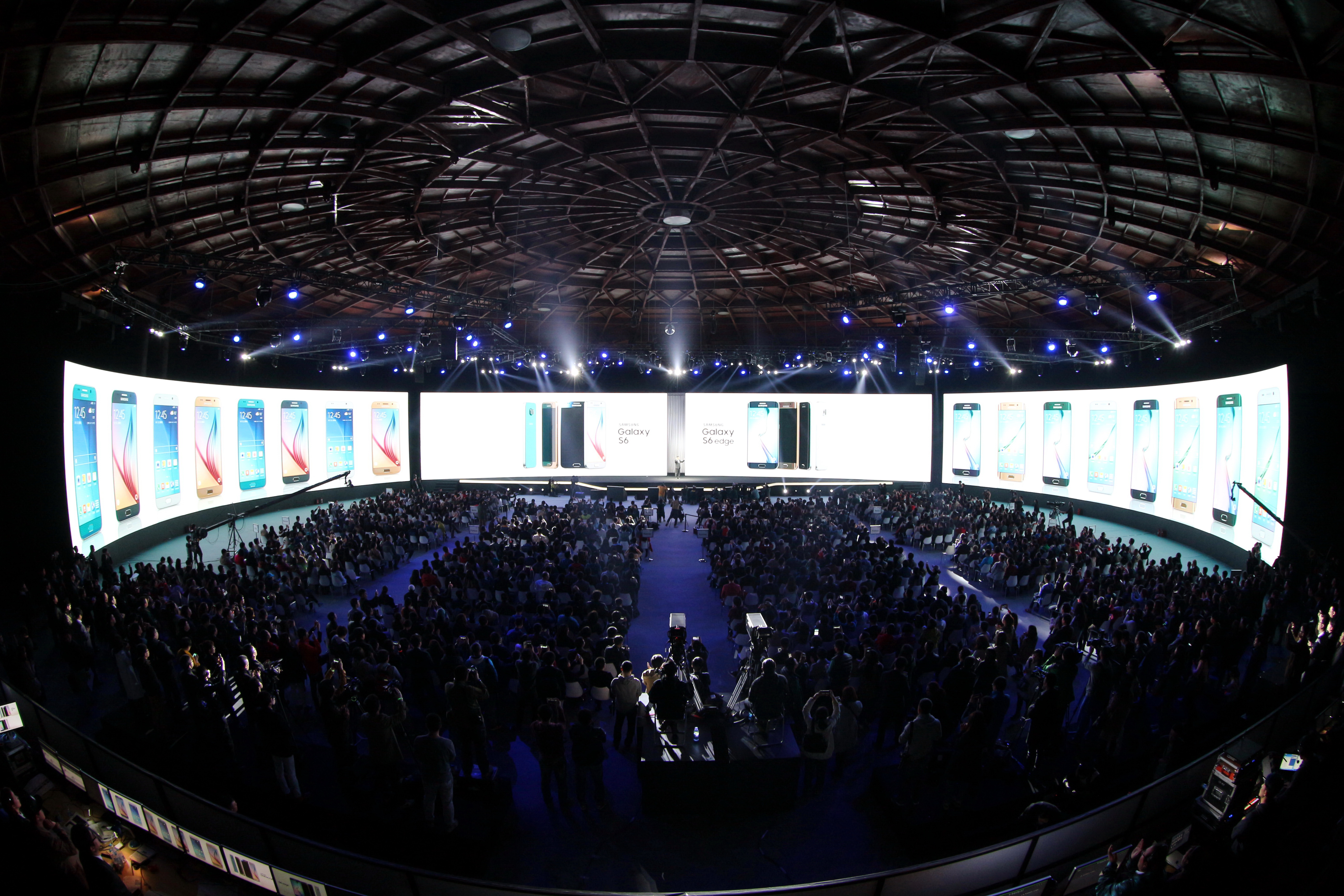 3월 31일 중국 베이징에서 열린 '갤럭시 S6' 월드투어 행사에서 '갤럭시 S6'와 '갤럭시 S6 엣지'가 최초로 공개되는 모습