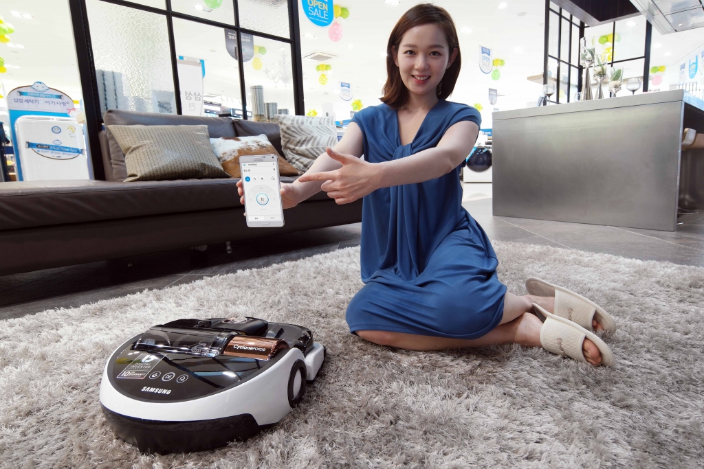삼성전자 모델이 2일 논현동 삼성 디지털프라자 강남본점에서 스마트폰의 앱으로 간편하게 조작할 수 있는 진공흡입 로봇청소기 ‘파워봇(POWERbot)’ 신모델을 소개하고 있다.