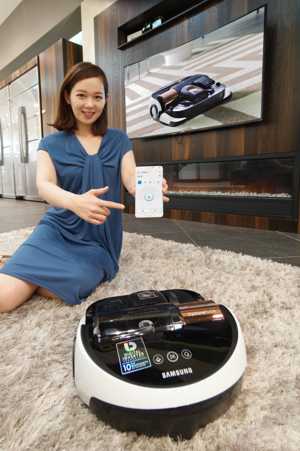 삼성전자 모델이 2일 논현동 삼성 디지털프라자 강남본점에서 스마트폰의 앱으로 간편하게 조작할 수 있는 진공흡입 로봇청소기 ‘파워봇(POWERbot)’ 신모델을 소개하고 있다.
