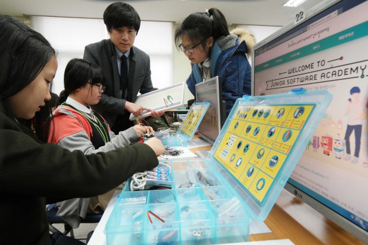 지난 1일, 서울 영란여자중학교 학생들이 삼성전자 '주니어 소프트웨어 아카데미' 메이킹(making) 과정에 참여하고 있다.
