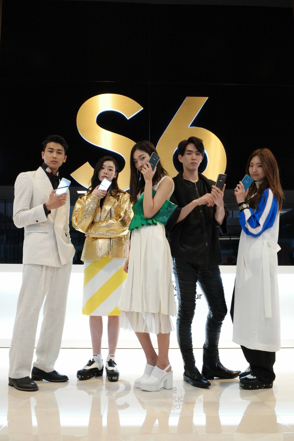 삼성전자 모델들이 총 5가지 색상의 '갤럭시 S6'와 '갤럭시 S6 엣지'를 소개하는 모습