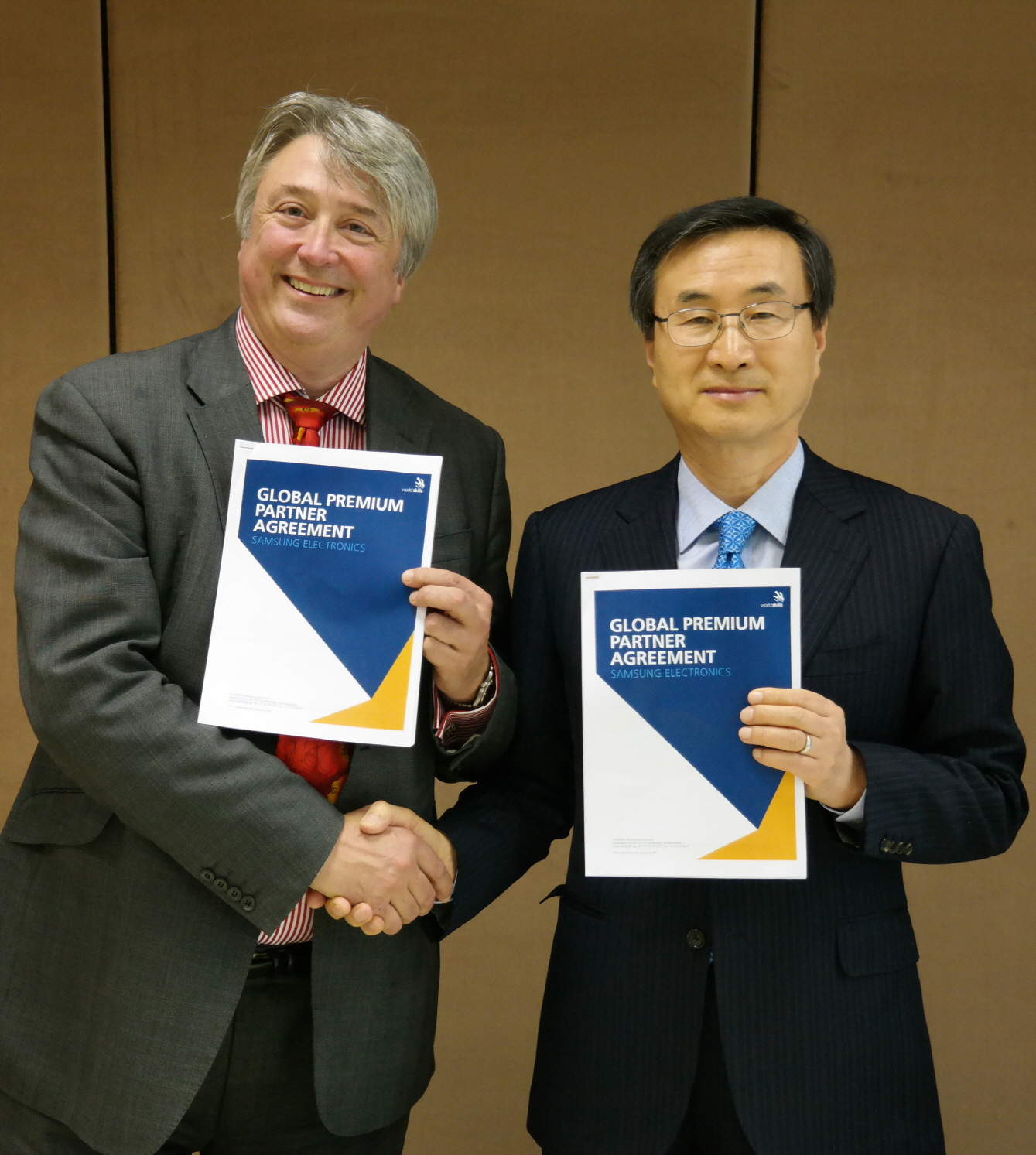 15일(현지시간) 브라질 상파울루 국제기능올림픽 조직위원회에서 (왼쪽부터) 사이먼 바틀리(Simon Bartley) 국제기능올림픽위원회 회장, 송지오 삼성기능올림픽 사무국장이 기능올림픽 후원 조인식을 하고 있다.