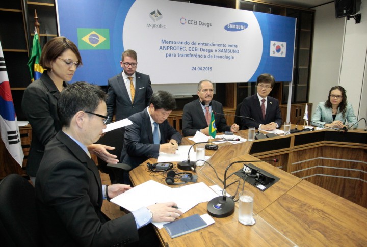 삼성전자와 대구 창조경제혁신센터는 24일(현지시간) 브라질의 수도인 브라질리아에 위치한 브라질 과학기술부에서 브라질 혁신기업진흥협회인 안프로텍 (Anprotec)과 창조경제혁신센터 모델 전파와 브라질 청년창업ㆍ스타트업 육성 협력을 위한 상호 협약(MOU)을 맺었다. (왼쪽부터 : 김선일 대구 창조경제혁신센터장, 김정환 삼성전자 중남미총괄, 알도 헤벨로(Aldo Rebelo) 과학기술부 장관, 최양희 미래창조과학부 장관, 프란실리니 프로코피오 가르시아(Francilene Procopio Garcia) 안프로텍 대표)