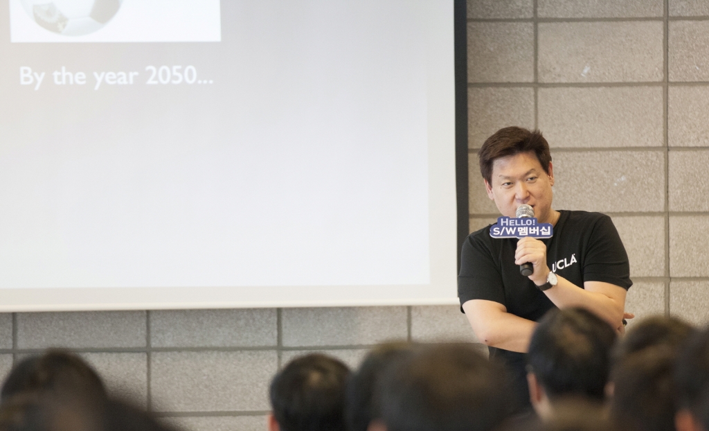 지난 25일 삼성소프트웨어멤버십 강남센터에서 열린 '헬로 소프트웨어멤버십' 토크 콘서트 행사에 참석한 데니스 홍 UCLA 대학교수가 소프트웨어의 비전을 제시하고 있다.