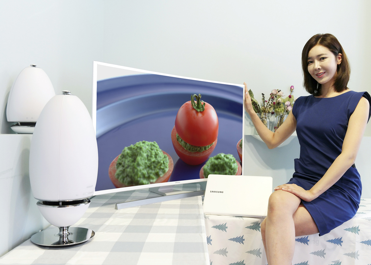 삼성전자는 소비자의 다양한 니즈를 충족시키기 위해 최근 흰색 베젤의 UHD TV, JU6990 모델을 출시하며2006년 보르도 TV 이후 흰색 디자인의 TV를 9년 만에 국내 시장에 선보였다. 사진은 삼성전자 모델이 신사동의 한 카페에서 홈스타일링 트렌드에 발맞춰 출시된 화이트 색상의 커브드 UHD TV, 오디오, 노트북을 선보이는 모습.