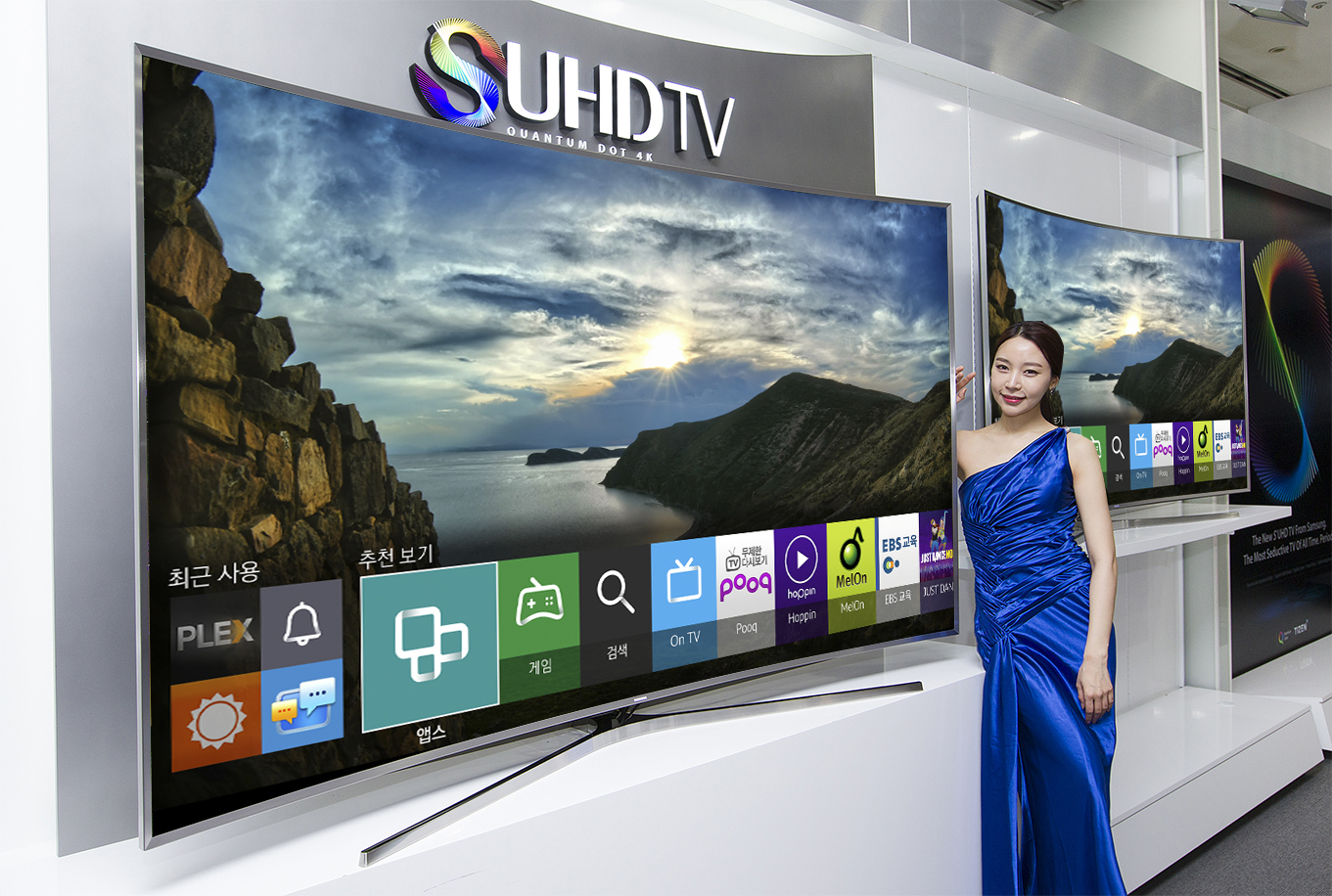 삼성전자는 미래창조과학부가 주최하는 '제22회 대한민국 멀티미디어 기술대상'에서 2013년 85형 UHD TV, 2014년 커브드 UHD TV에 이어 타이젠 TV로 3년 연속 대통령상을 수상하게 됐다고 20일 밝혔다. 사진은 삼성전자 모델이 멀티미디어 기술대상을 수상한 2015년형 타이젠 TV를 선보이는 모습.