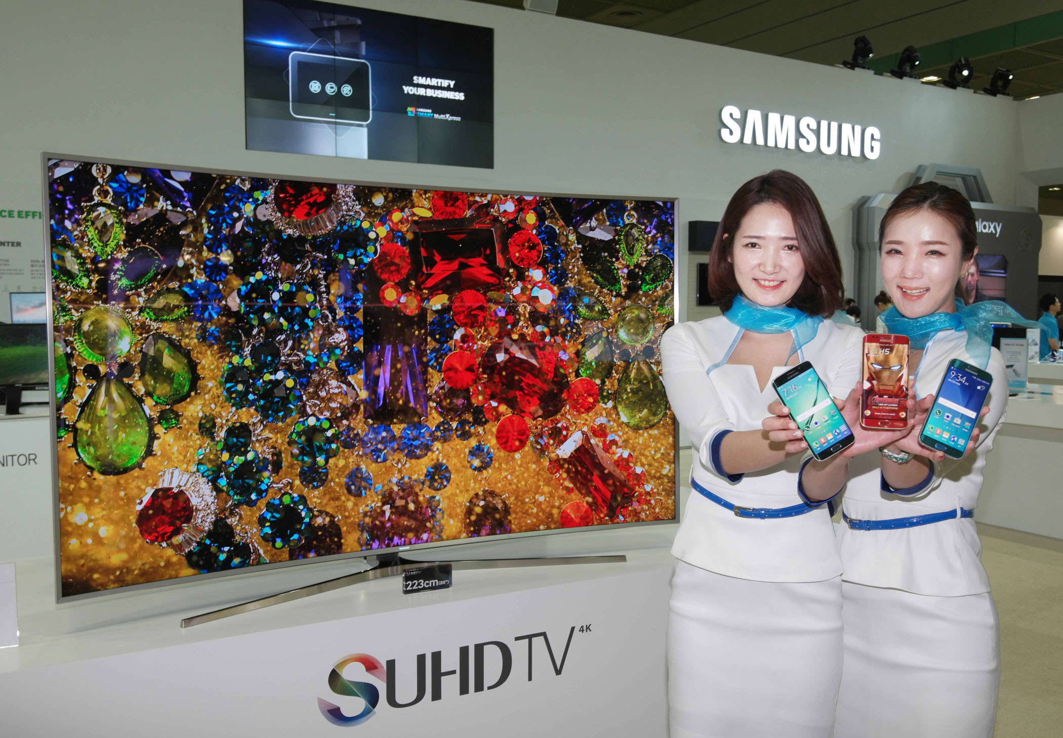 서울 삼성동 코엑스에서 열리는 WIS 2015 삼성전자 부스에서 삼성전자 전시 도우미가 88형 SUHD TV를 소개하고 있다.