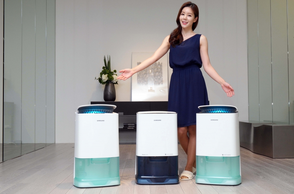 삼성전자 모델이 28일 삼성전자 수원사업장 생활가전동 프리미엄 하우스에서 소비전력을 절감하고 한 눈에 수위를 확인하는 '이지케어물통'을 채용한 '2015년형 삼성 인버터제습기'를 소개하고 있다.