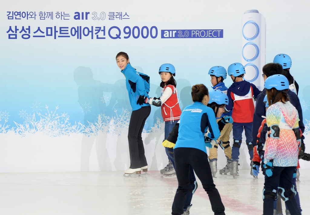 '삼성 스마트에어컨 Q9000'의 모델 김연아가 5월 30일 목동 아이스링크에서 일일 스케이트 전도사로 나서 '김연아와 함께하는 air 3.0 클래스' 이벤트에 참여한 어린이들과 함께 스케이트를 타고 사진을 찍으며 즐거운 시간을 보내고 있다.