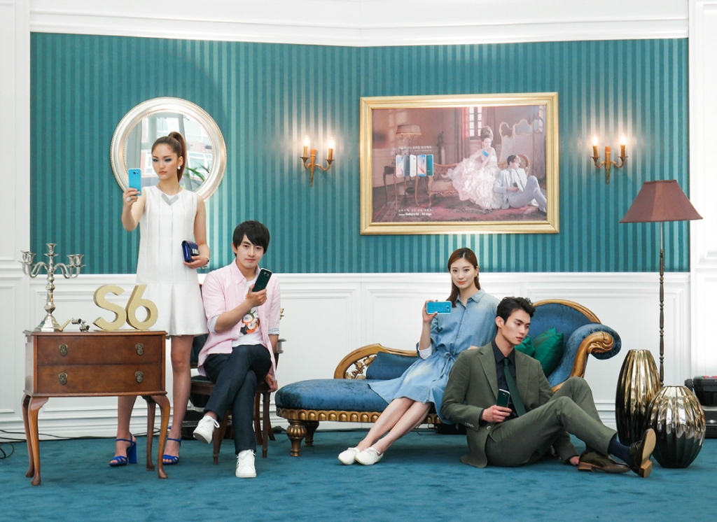 지난 30일 서울 영등포 타임스퀘어 내에 패션 화보 촬영장 처럼 연출된 '갤럭시 S6 컬러 스튜디오'에서 현장을 찾은 소비자들이 패션 모델들과 함께 '갤럭시 S6' 블루 토파즈와 '갤럭시 S6 엣지' 그린 에메랄드를 들고 포즈를 취하고 있다.