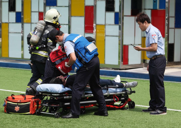 삼성전자 응급 구조대원이 환자를 구조하는 장면을 재난망용 스마트폰으로 중앙관제소에 실시간으로 전송하고 있다.