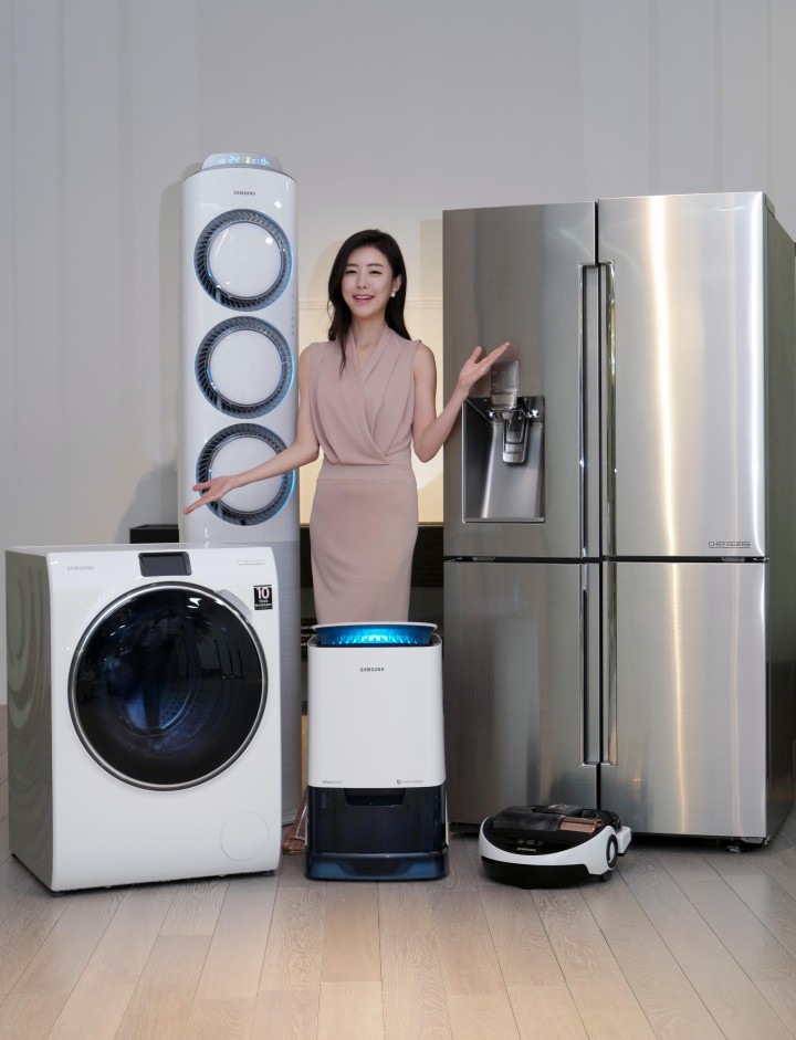 삼성전자 모델이 18일 삼성전자 수원사업장 생활가전동 프리미엄 하우스에서 '인버터 컴프레서'와 '인버터 모터'의 무상보증 기간이 10년으로 일원화된 삼성 생활가전 제품들을 소개하고 있다.