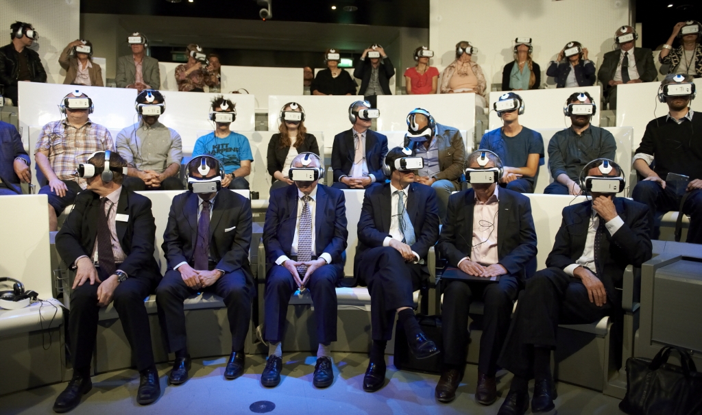 18일(현지 시간) 영국 런던에 위치한 국립 자연사 박물관(Natural History Museum)에서 진행된 오프닝 행사에서 참석자들이 갤럭시 S6와 기어 VR을 통해 프로그램을 체험하는 모습