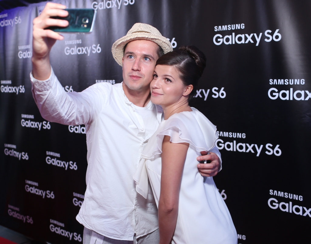 행사에 참석한 러시아 배우 예고르 코레쉬코프(Yegor Koreshkov, 사진 왼쪽)와 아그니야 쿠즈네초바(Agniya Kuznetsova, 사진 오른쪽)가 갤럭시 S6로 셀피 촬영하고 있다.