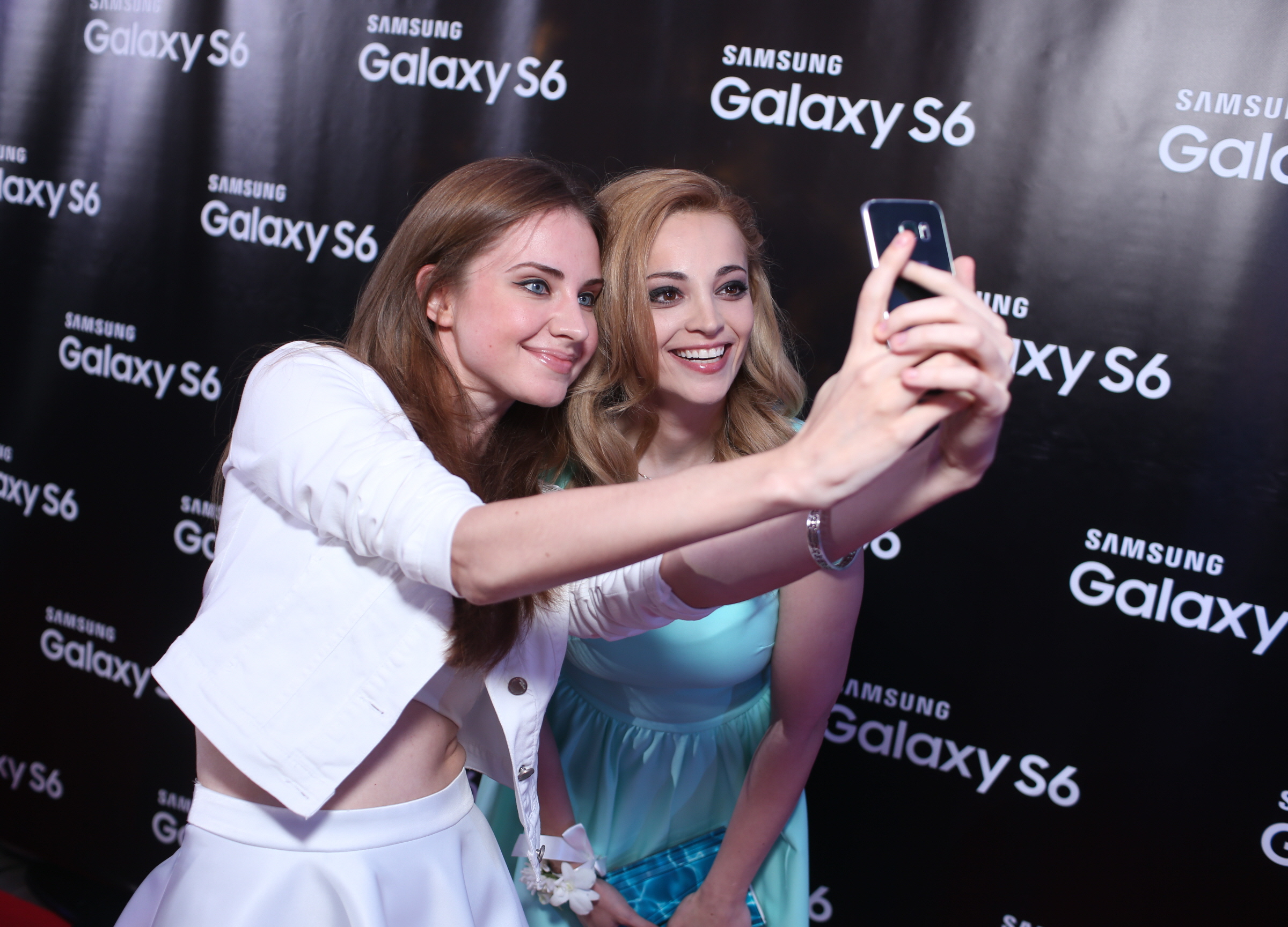 행사에 참석한 러시아 가수 테오나 돌니코바(Teona Dolnikova, 사진 오른쪽)가 일행과 함께 갤럭시 S6로 셀피 촬영하고 있다.