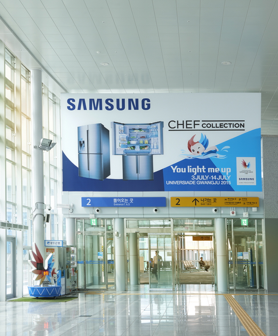 '2015 광주 하계유니버시아드' 전자 부문 공식 후원사인 삼성전자가 대회 개막을 앞두고 광주를 찾은 선수단과 스포츠팬들을 환영하는 광고를 광주 KTX 송정역 내부에 설치했다.