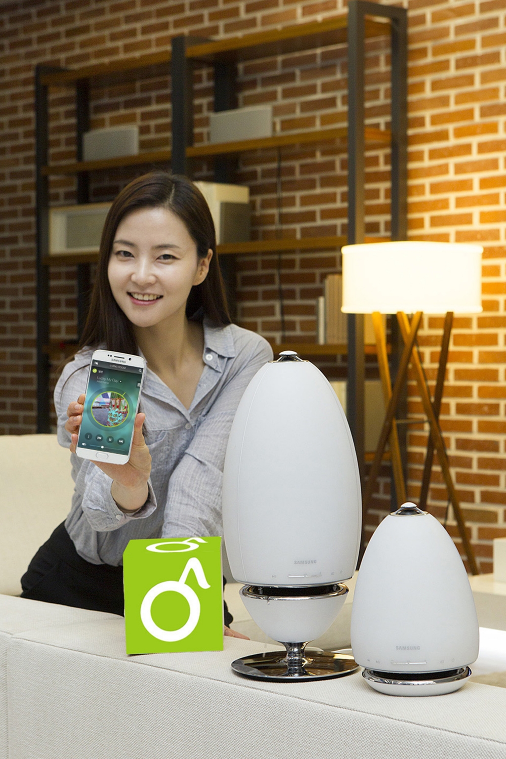 삼성전자 모델이 삼성 무선 360 오디오의 ‘무선 멀티룸 오디오앱’으로 이용할 수 있는 멜론 서비스를 소개하고 있다.