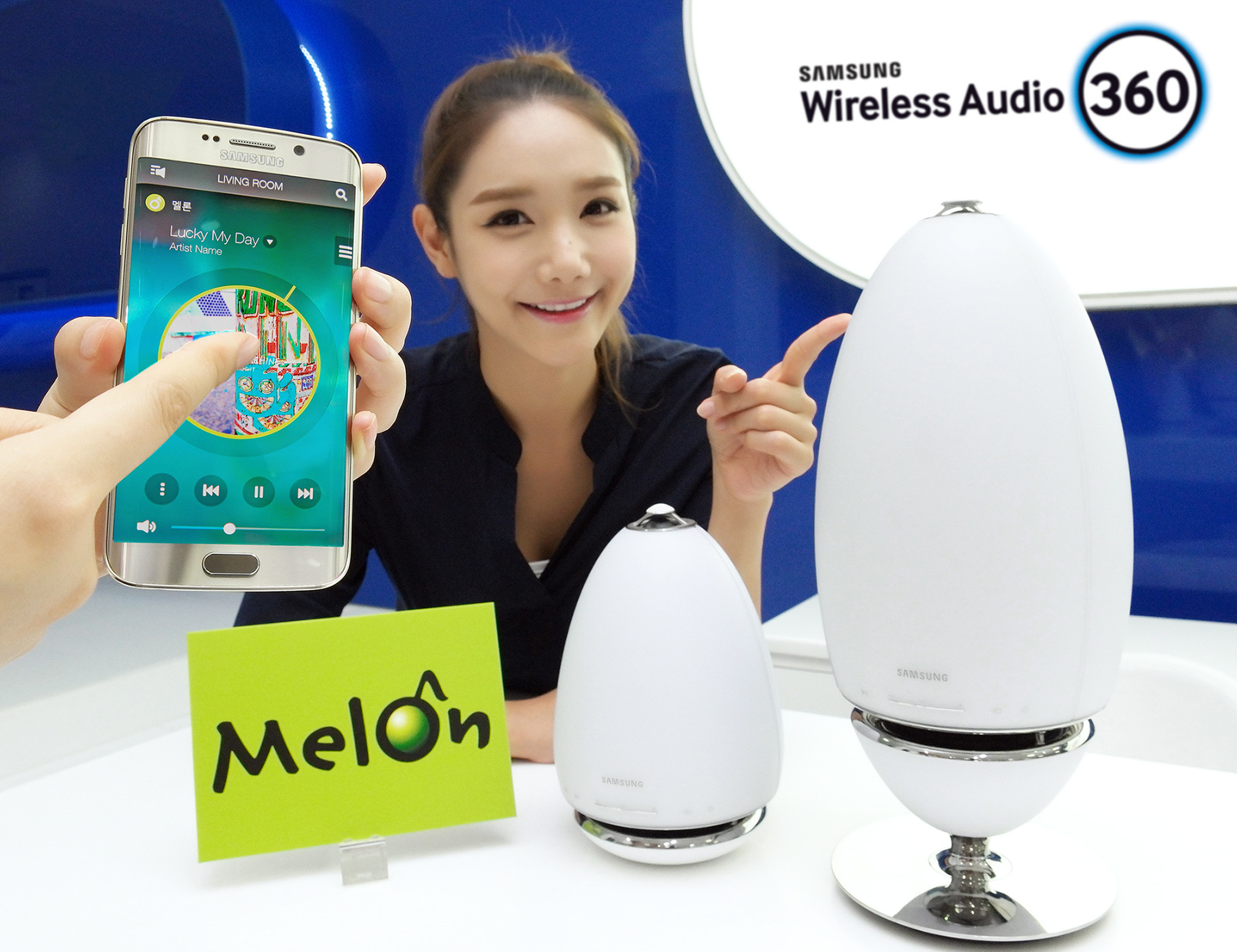 삼성전자 모델이 60일 이용권으로 멜론의 고품질 음원을 즐길 수 있는 무선 360 오디오를 소개하고 있다