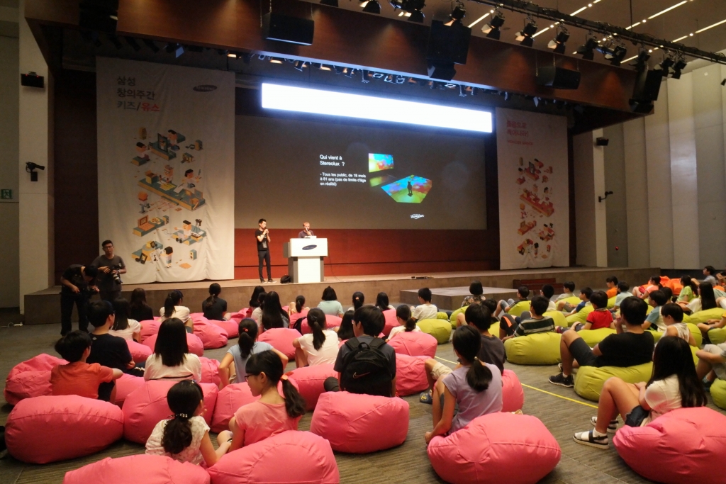 11일 삼성전자 서초사옥에서 열린 '삼성 크리에이티브 멤버십 창의주간'에 참가한 청소년들이 프랑스 아티스트 Cedric Huchet의 '일렉트로닉 예술세계와 창조적 문화 경영' 강의를 듣고 있다.