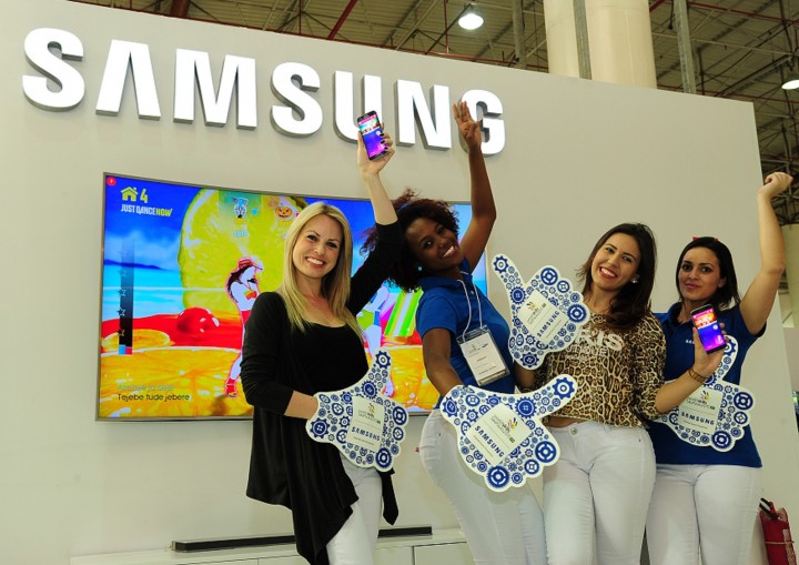 브라질 상파울루에서 열린 제 43회 국제기능올림픽(World Skill Competition) 삼성 체험관에서 현지 관람객들이 88인치 곡면 SUHD TV와 S6로 댄스 게임을 즐기고 있다.