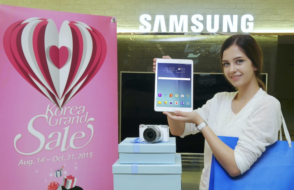 삼성전자 모델이 19일 서초동 삼성 딜라이트 면세 매장에서 태블릿과 카메라 등을 소개하고 있다. 삼성전자는 8월 14일부터 10월 31일까지 대한민국 전역에서 펼쳐지는 '코리아 그랜드 세일'에 적극적으로 동참해 면세점과 삼성 디지털프라자 면세 매장에서 행사 제품을 구매하는 외국인 관광객에게 푸짐한 사은품을 증정한다.