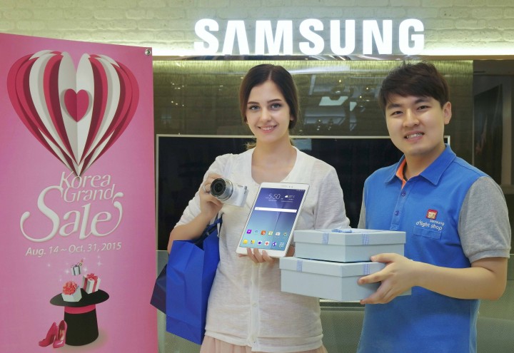 삼성전자 모델과 삼성 딜라이트 직원이 19일 삼성 딜라이트 면세 매장에서 태블릿과 카메라 등을소개하고 있다. 삼성전자는 8월 14일부터 10월 31일까지 대한민국 전역에서 펼쳐지는 '코리아 그랜드 세일'에 적극적으로 동참해 면세점과 삼성 디지털프라자 면세 매장에서 행사 제품을 구매하는 외국인 관광객에게 푸짐한 사은품을 증정한다.