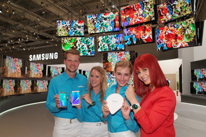 SUHD TV 하이라이트 존에서 삼성전자 모델과 IFA걸이 왼쪽부터 '갤럭시 S6 엣지+' ,'갤럭시 노트5', '삼성 기어 S2', '슬립센스', '삼성 기어 S2'를 소개하고 있다.