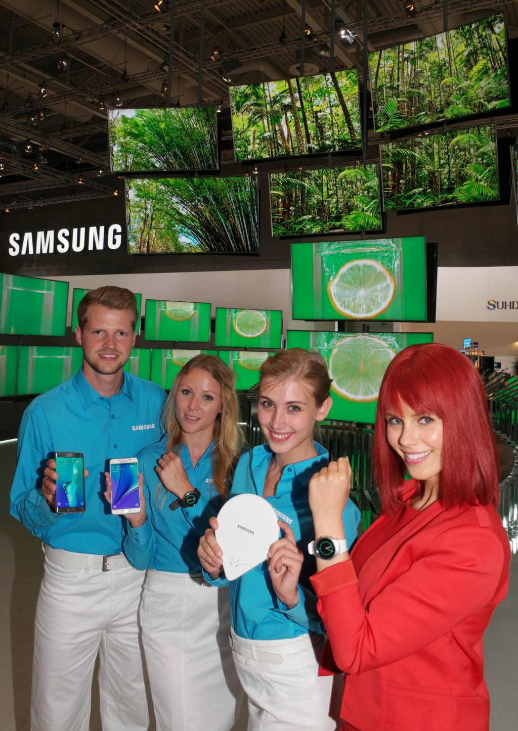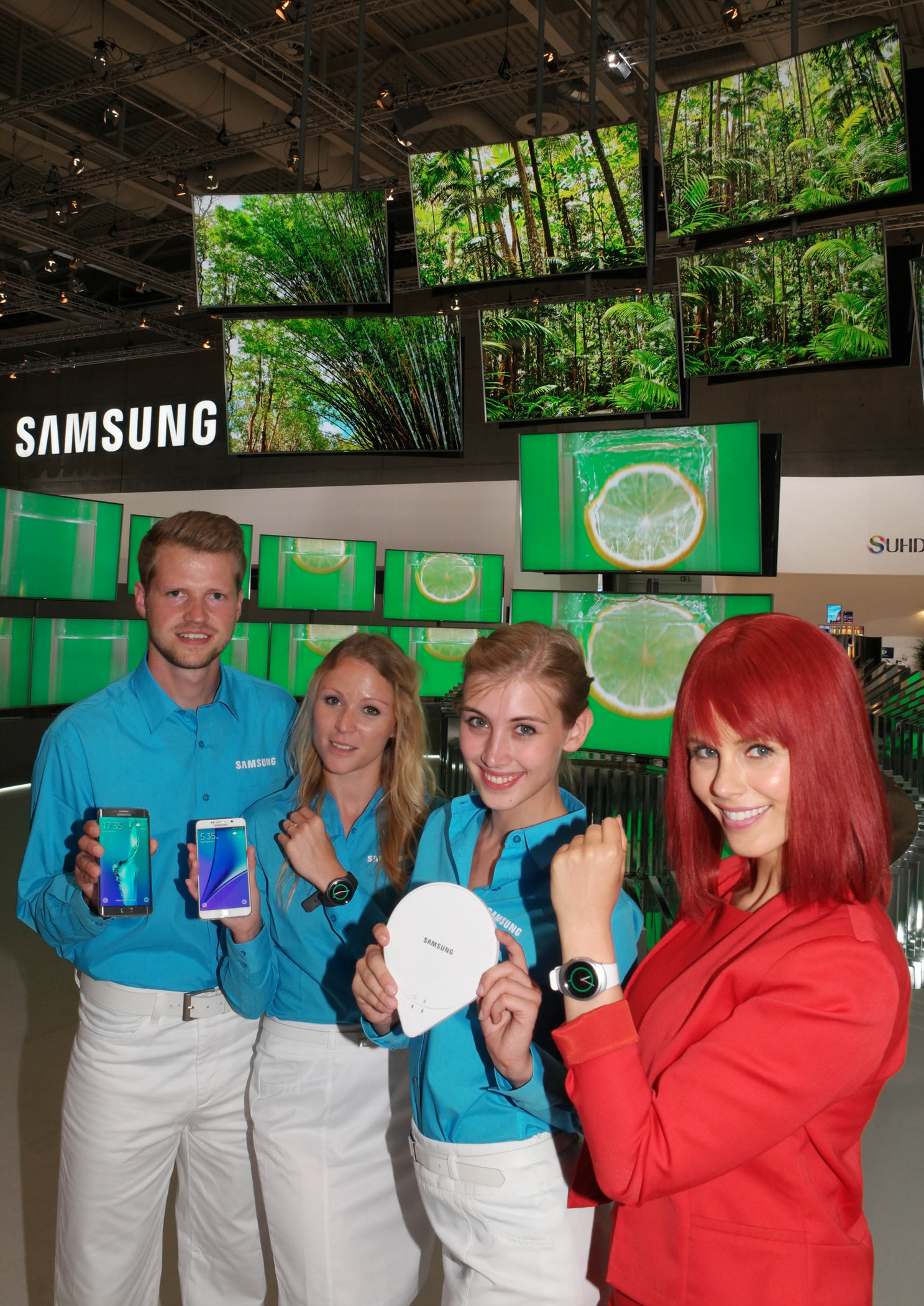 SUHD TV 하이라이트 존에서 삼성전자 모델과 IFA걸이 왼쪽부터 '갤럭시 S6 엣지+' ,'갤럭시 노트5', '삼성 기어 S2', '슬립센스', '삼성 기어 S2'를 소개하고 있다.
