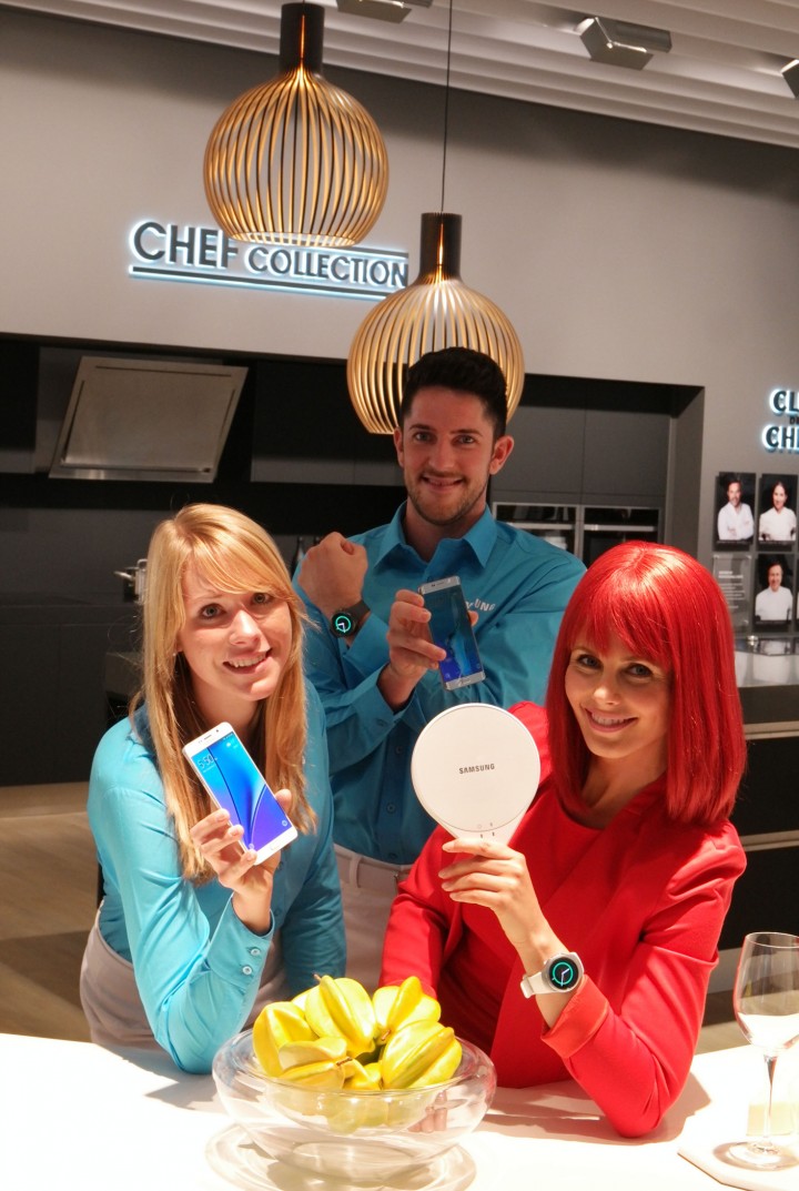 삼성전자 모델과 IFA걸이 ‘시티큐브 베를린(CityCube Berlin)’ 전시장의 생활가전 전시 부스에서 왼쪽부터'갤럭시 노트5', '삼성 기어 S2', '갤럭시 S6 엣지+' ,'슬립센스', '삼성 기어 S2'를 소개하고 있다.
