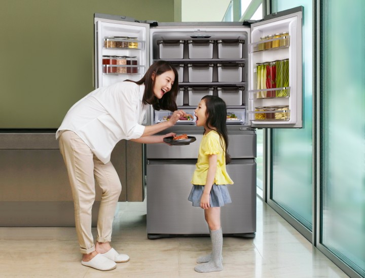삼성전자 김치냉장고 광고모델 이현이씨와 어린이 모델이 스테인리스 소재의 '메탈쿨링김치통'을 탑재해 더욱 업그레이드된 '메탈그라운드' 기술로 제대로 된 '한 겨울 땅속 김치맛'을 구현한 2016년형 삼성 '지펠아삭' 김치냉장고를 소개하고 있다.