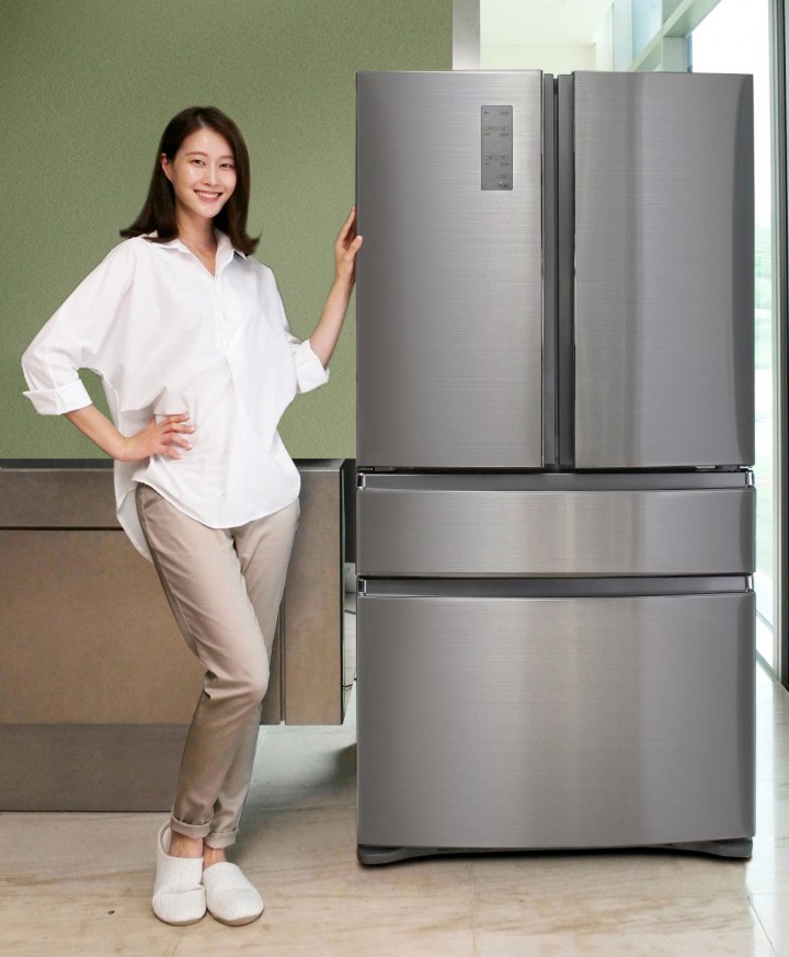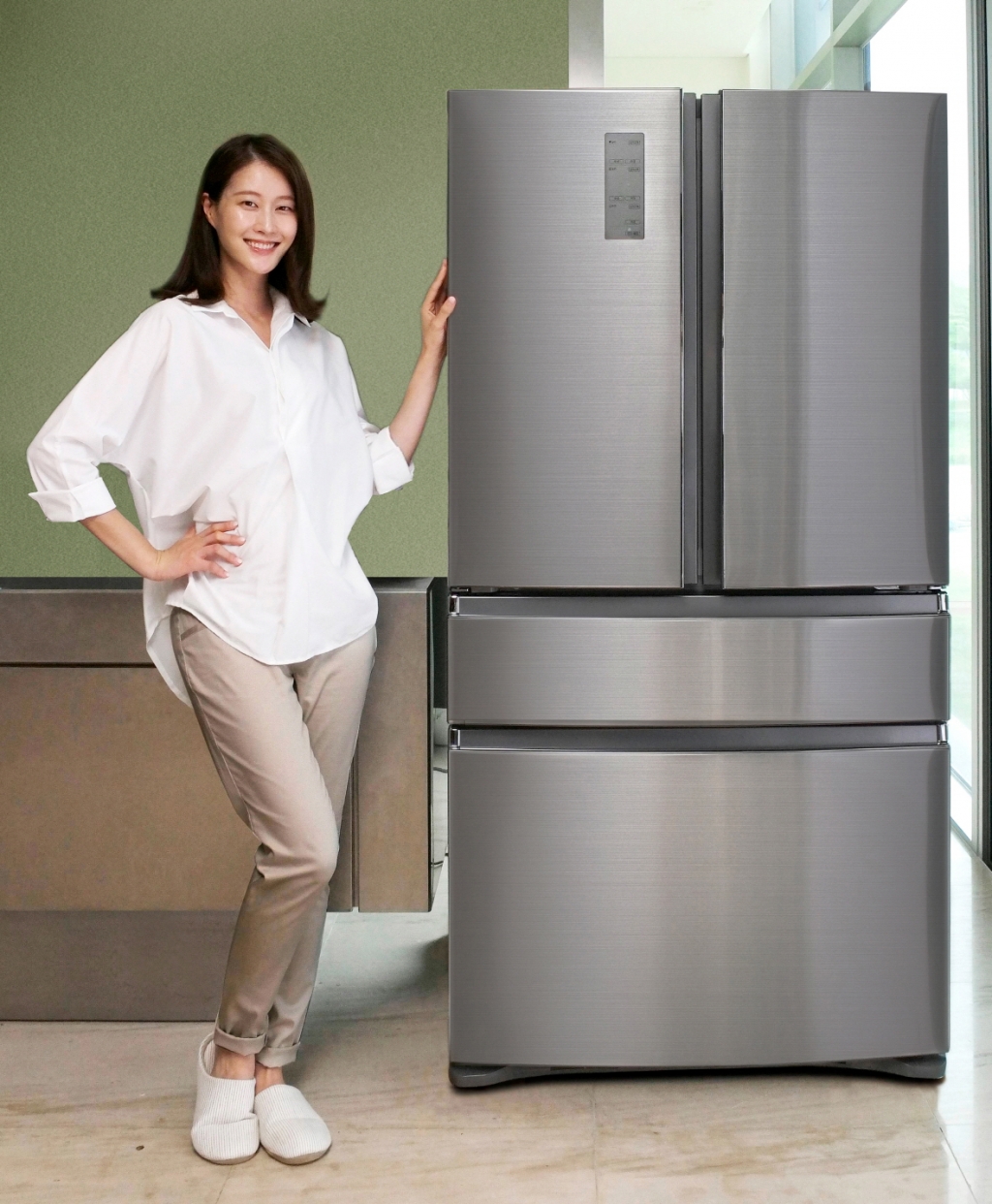 삼성전자 김치냉장고 광고모델 이현이씨가 스테인리스 소재의 '메탈쿨링김치통'을 탑재해 더욱 업그레이드된 '메탈그라운드' 기술로 제대로 된 '한 겨울 땅속 김치맛'을 구현한 2016년형 삼성 '지펠아삭' 김치냉장고를 소개하고 있다.