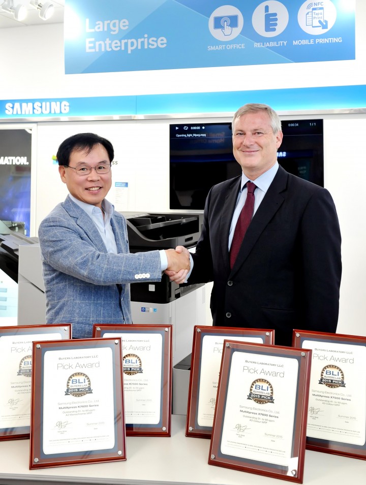 삼성전자 프린팅솔루션 사업부 개발팀 팀장 김용제 부사장과 미국 사무기기 전문 평가기관인 바이어스랩(Buyers Laboratory Inc.) 게리 오루크(Gerry O’Rourke) 디렉터가 악수를 하고 있다.
