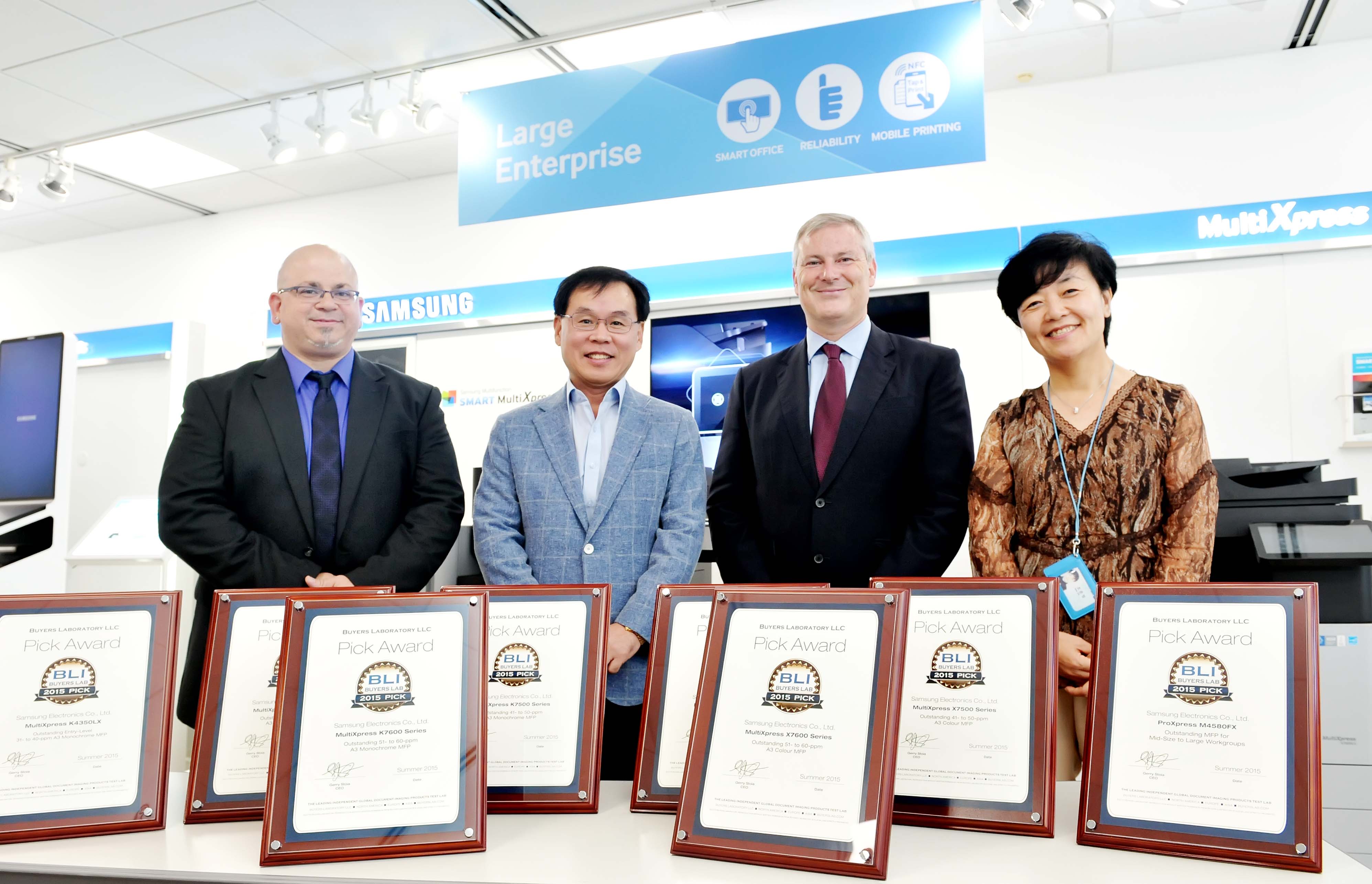 지난 4일 수원 삼성전자 디지털시티에서 ‘바이어스랩 2015 썸머 어워드’의 ‘최우수 제품상’ 수여식이 있었다. 피트 에모리(Pete Emory) 바이어스랩 디렉터, 김용제 삼성전자 프린팅솔루션 사업부 개발팀 팀장(부사장), 게리 오루크(Gerry O’Rourke) 바이어스랩 디렉터, 조은정 삼성전자 프린팅솔루션 사업부 마케팅파트 파트장(상무)(왼쪽부터)