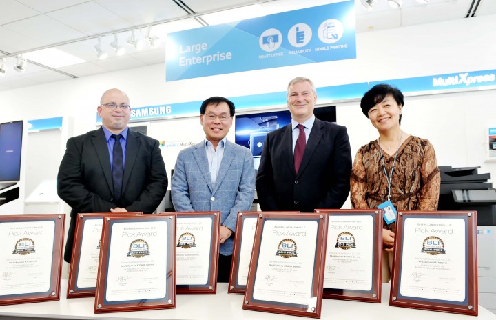 지난 4일 수원 삼성전자 디지털시티에서 ‘바이어스랩 2015 썸머 어워드’의 ‘최우수 제품상’ 수여식이 있었다. (왼쪽부터)바이어스랩 피트 에모리(Pete Emory) 디렉터, 삼성전자 프린팅솔루션 사업부 개발팀 팀장 김용제 부사장, 바이어스랩 게리 오루크(Gerry O’Rourke) 디렉터, 삼성전자 프린팅솔루션 사업부 마케팅파트 파트장 조은정 상무.