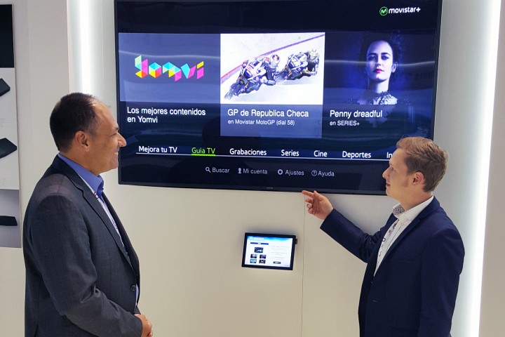 삼성전자 담당자가 네덜란드 암스테르담에서 열린 IBC 2015에서 스페인 텔레포니카의 IPTV서비스가 삼성 스마트TV에서 셋톱박스 없이 제공되는 것을 설명하고 있다.