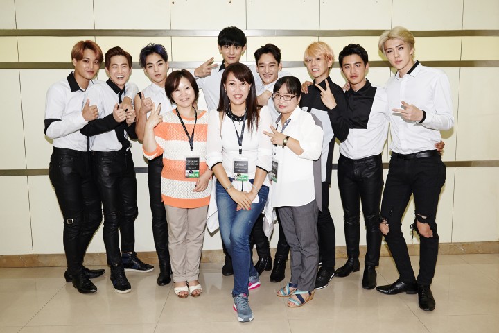 12일 중국 충칭에서 열린 EXO(엑소) 콘서트에 통역사로 고용돼 함께한 결혼이주여성들과 EXO 멤버들이 기념 사진을 촬영하고 있다.