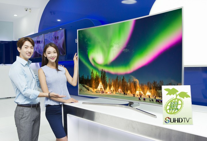 삼성전자 모델들이 한국녹색구매네트워크가 선정한 '올해의 녹색상품' 상을 받은 삼성 SUHD TV를 소개하고 있다.